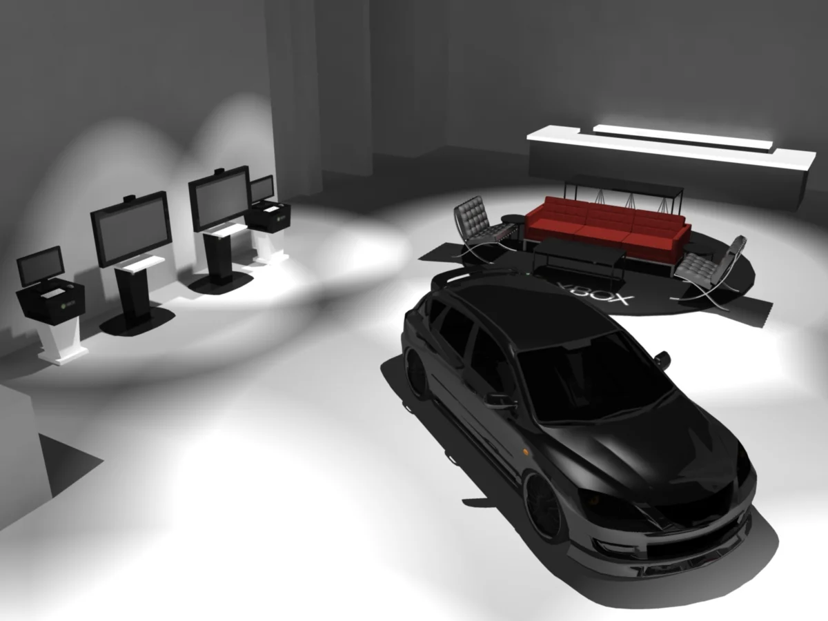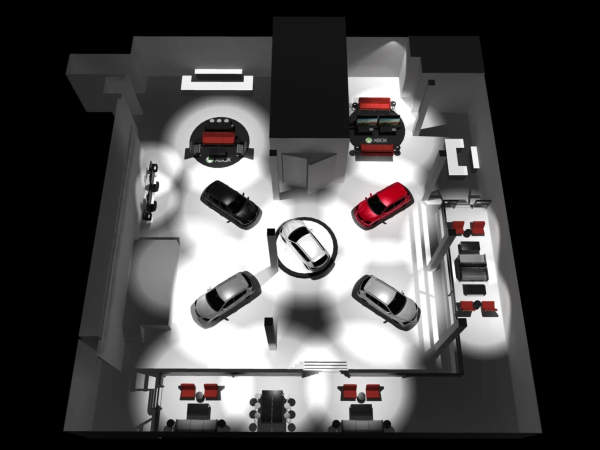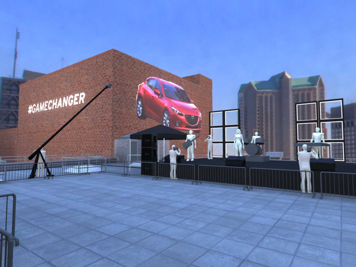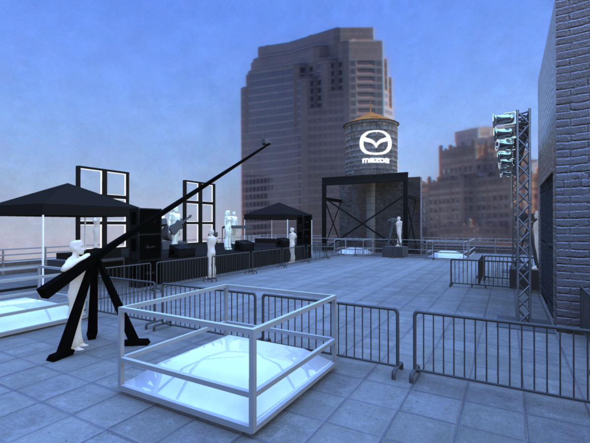 We were also responsible for helping to design the look and feel of the event. We first created blueprints of the layout venue and event layout, then worked on detailed 3D mocks, showing placement of all the cars, signs, activations, stages, furniture, lounge areas and positions for the film crew.